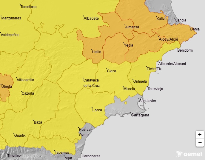 Aviso amarillo de altas temperaturas y tormentas en las próximas horas para la Región de Murcia